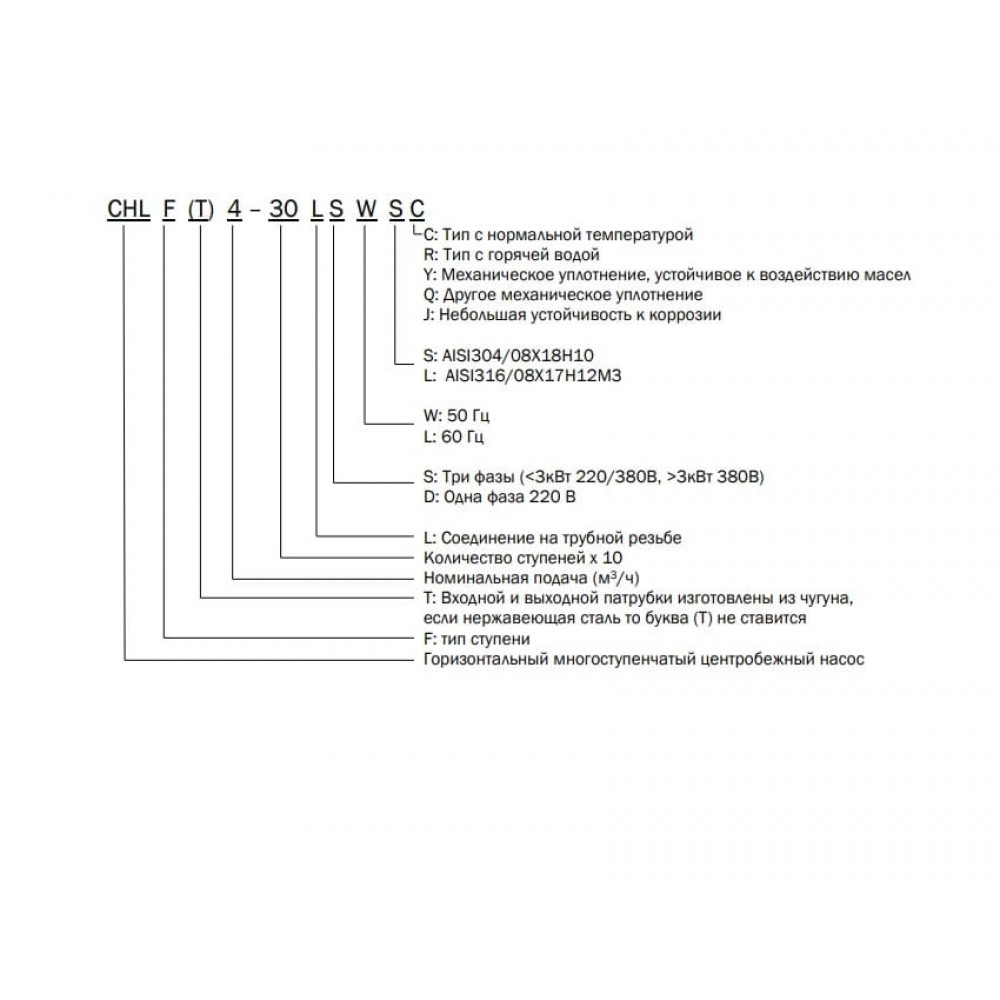 CNP CHL 4-40 LSWSR представляет собой трехфазный горизонтальный многоступенчатый несамовсасывающий центробежный электронасос, высокотемпературное исполнение. Насосный агрегат состоит из проточной части и электродвигателя с основанием. Гидравлическая часть собрана из секций (направляющий аппарат + рабочее колесо) на удлиненном валу электродвигателя, стянута с использованием специальных стяжек с резьбовыми концами и помещена в общий корпус, изготовленный из нержавеющей стали.